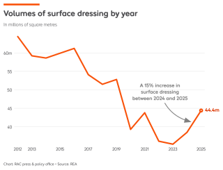 Figures from the Road Emulsion Association (REA) show that around 44.4 million square metres of surface dressing – enough to treat 4,340 miles of road – was applied over the April-to-September preventative maintenance season in 2025, compared to 38.5 million in 2024.