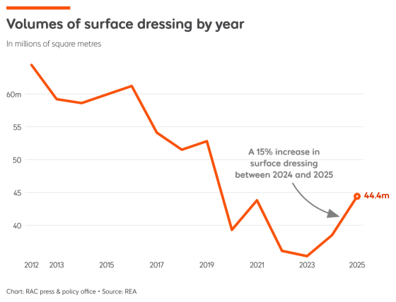 “We hope even more surface dressing will be carried out going forwards as the government is on board with the preventative maintenance message that the RAC, REA and the Road Surface Treatments Association have been advocating.