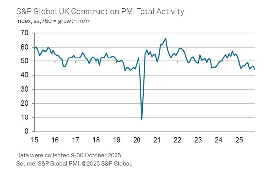 The headline S&P Global UK Construction Purchasing Managers’ Index (PMI) registered 44.1 in October, down from 46.2 in September. It has not been and below the 50.0 no-change mark every month this year so far.